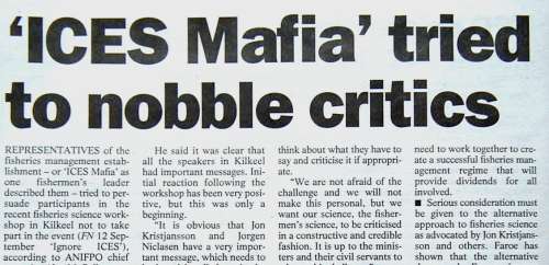 Prior to the workshop several participants were approached by the "ICES Mafia", as they were described by one fishermen's representative, and attempts were made to dissuade them from taking part in or attending the event. This tied in with attempts to discredit and undermine Mr. Kristjansson's reputation long before the Kilkeel workshop and indeed in the run up to the event telephone calls were even received by fishermen's representatives from known individuals attempting to pour scorn upon Mr. Kristjansson.