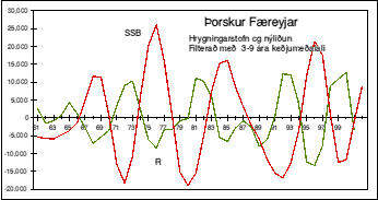 1. Hrygningarstofn þorsks við Færeyjar er ekkert stöðugt fyrirbæri. Hann sveiflast upp og niður með reglulegum hætti, frá 20 - 120 þús tonn. Að meðaltali er hann stór eins og Einar bendir á en verður ærið lítill á stundum. Sagði Einar ekki að hann væri stór vegna lítillar veiði og þess vegna væri nýliðun góð?