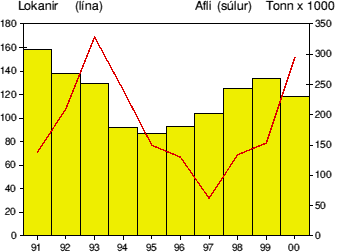 Hér má sjá saman fjölda skyndilokana (línurit) og afla (súlurit). Þarna er greinilega sami taktur en tveimur árum eftir að fjöldi skyndilokana nær hámarki minnkar aflinn (-síðar)! Greinilega ekki það sem ætlast var til.