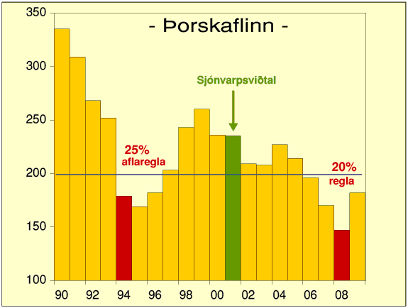Þróun þorskafla 1990-2009. Greinin hér að ofan var skrifuð 2001, græna súlan. Spáin sem þar var sett fram var þessi: Miðað við þessa reynslu ætti þorskafli að halda áfram að falla 2001 og ná lágmarki 2 árum eftir hámark lokana, þ.e. árið 2003. Verður þetta þróunin? Þetta reyndist rétt, en átti svo enn eftir að versna.